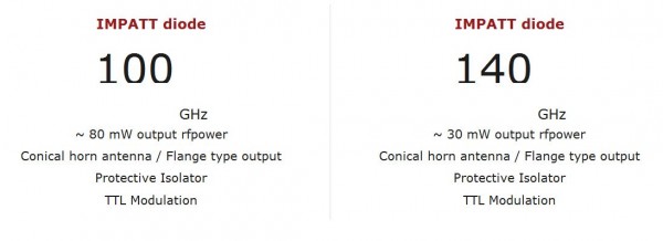 Terasense is now offering its upgraded version of IMPATT diode. The upgraded IMPATT diode is outfitted with a protective isolator, which significantly improves output power stability. From now on you can order IMPATT diode with either rigidly fixed horn antenna or WR- flange of your choice. Typical output rfpower of IMPATT diode with optimized frequency @ 100 GHz can reach up to 80 mW.